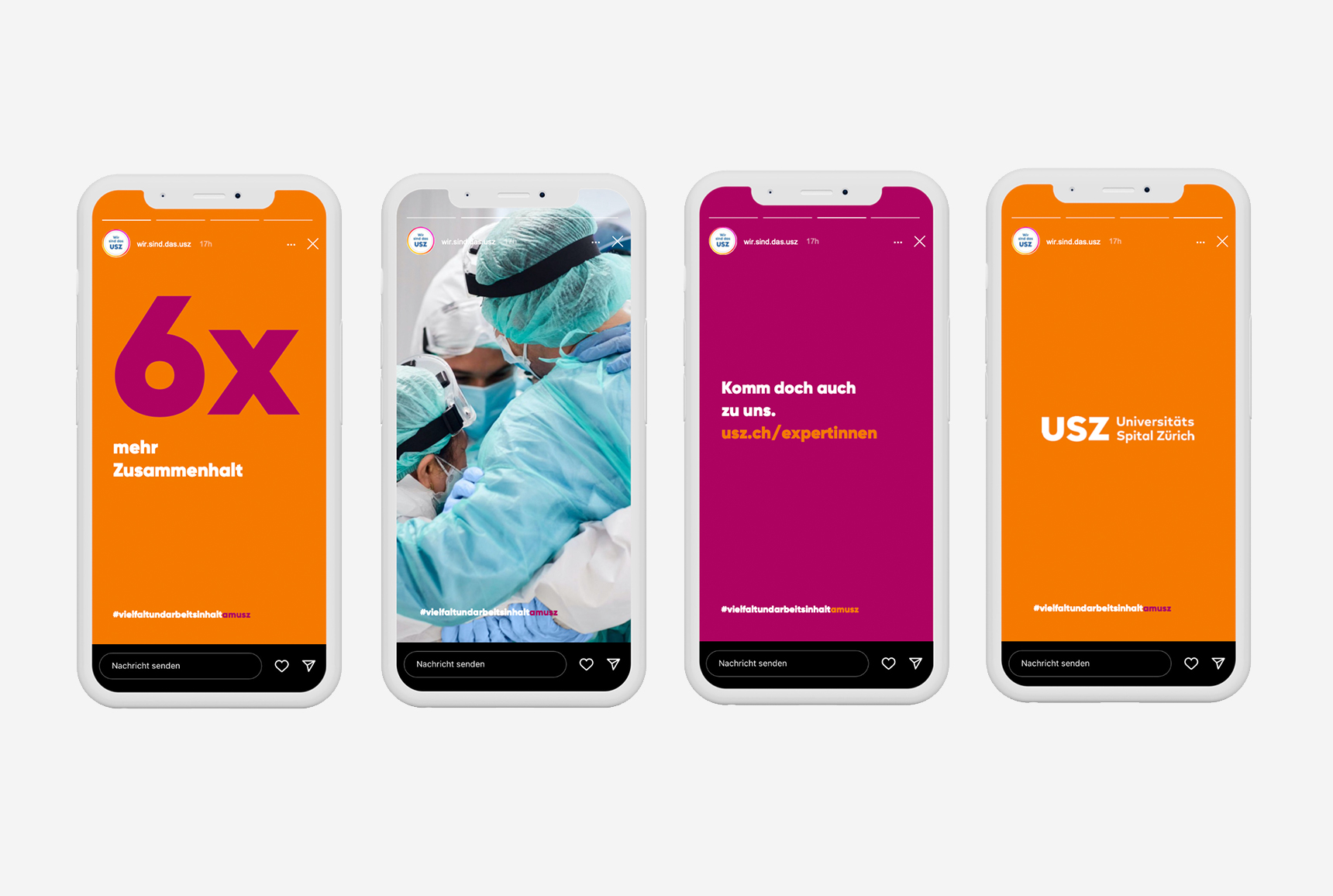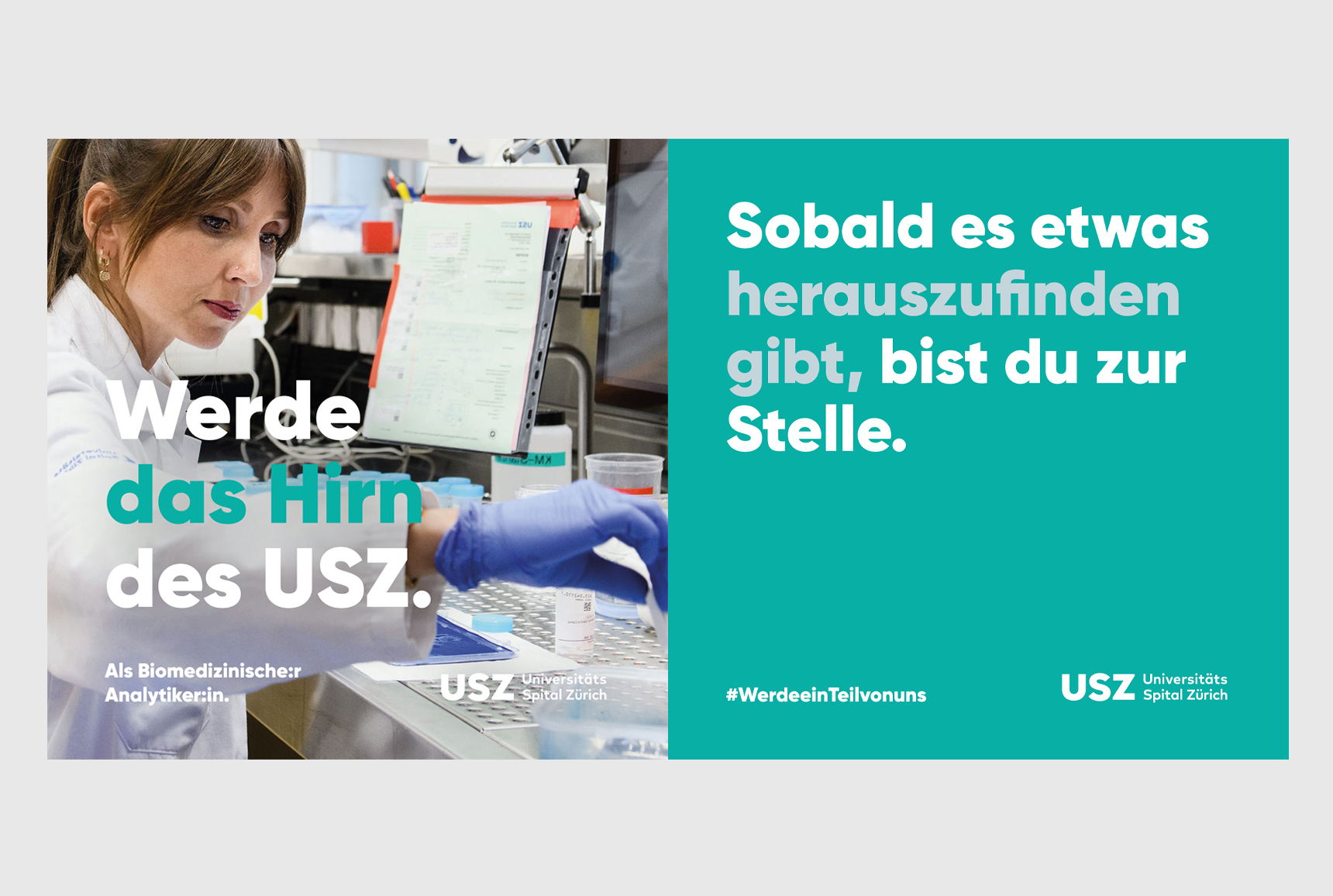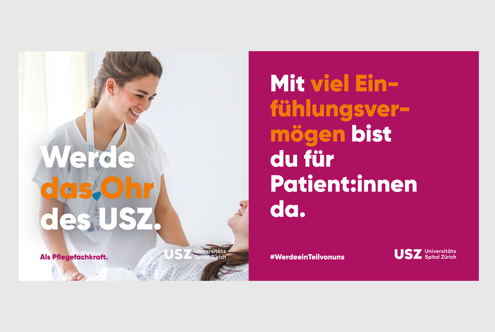 A modern and authentic employer branding that reflects the excellence of the University Hospital Zurich (USZ): Through a clear social media strategy, creative advertising campaigns, and an impressive trade fair presence, we showcase what makes USZ unique as an employer.