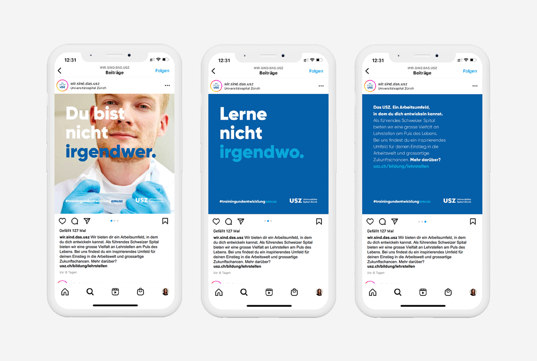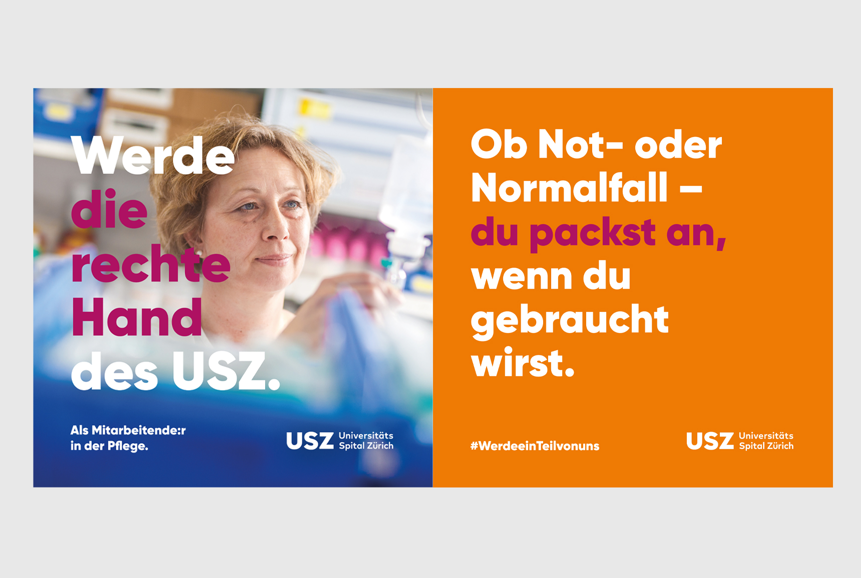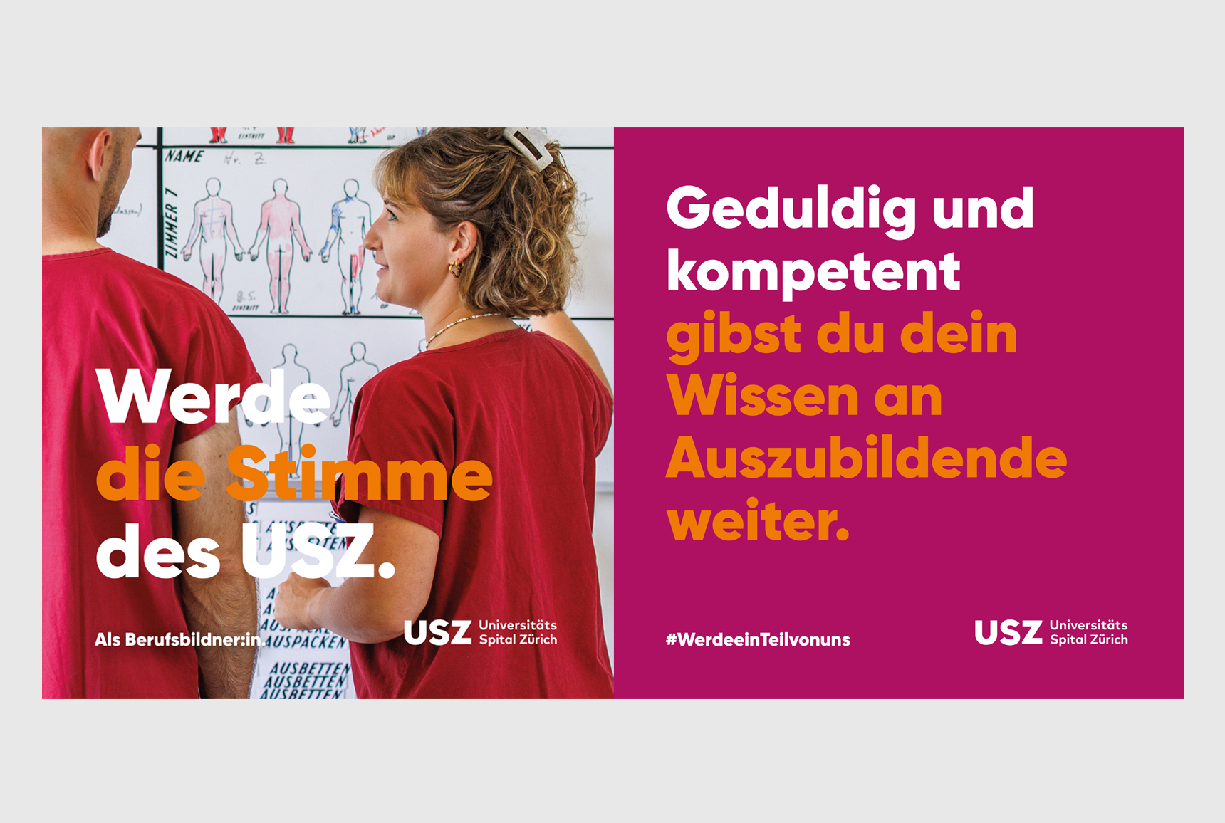 A modern and authentic employer branding that reflects the excellence of the University Hospital Zurich (USZ): Through a clear social media strategy, creative advertising campaigns, and an impressive trade fair presence, we showcase what makes USZ unique as an employer.