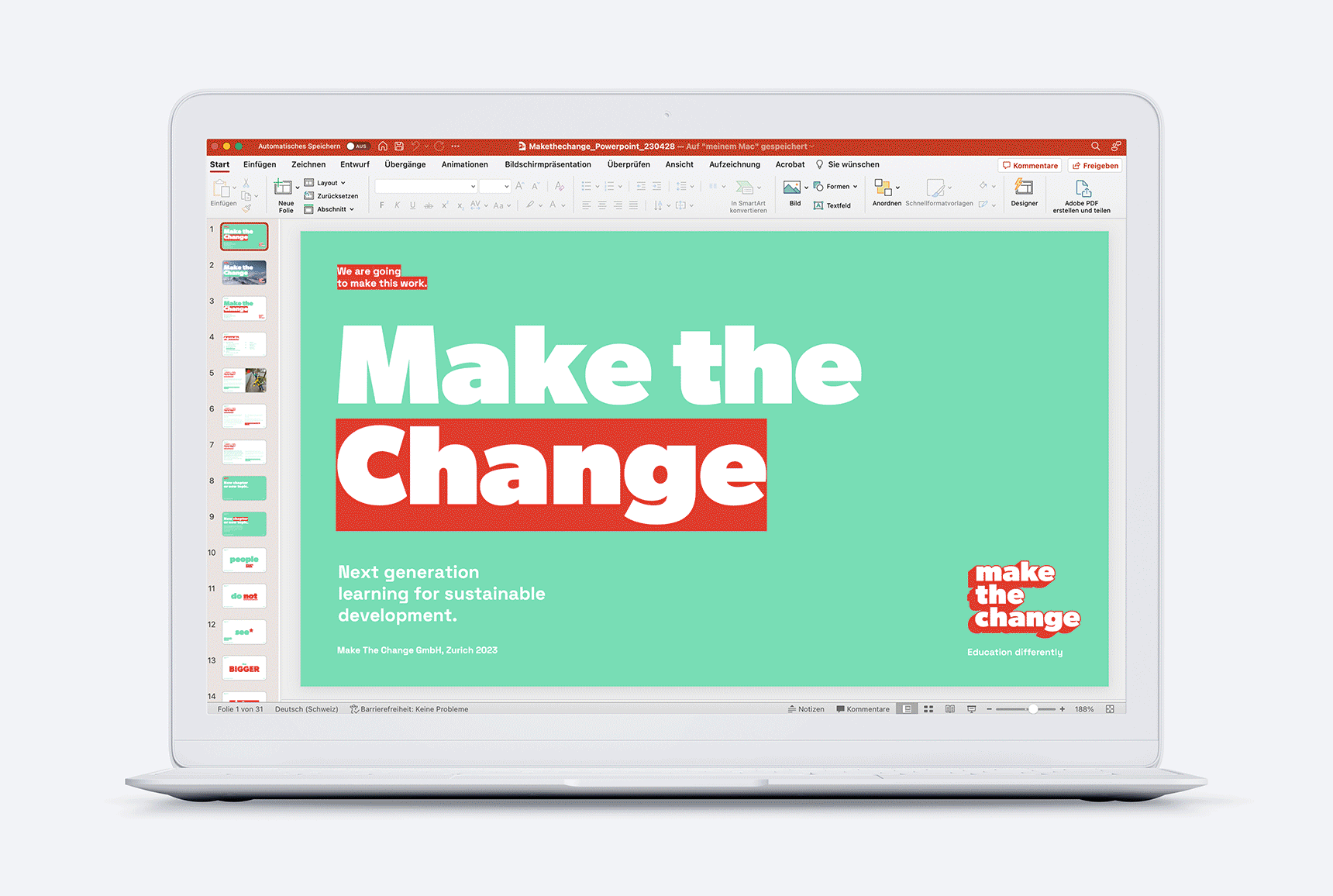 Ein Name, eine Vision, eine Bewegung. Make the Change steht für eine neue Art des Lernens – mutig, kreativ und zukunftsorientiert. Es geht nicht nur darum, das Schulsystem zu verändern, sondern auch der nächsten Generation eine neue Denkweise zu zeigen. Durch starkes Storytelling, raffiniertem Design und inspirierende Inhalte werden Unternehmen dazu ermutigt, gemeinsam mit der jungen Generation den Weg in die Zukunft zu ebnen.